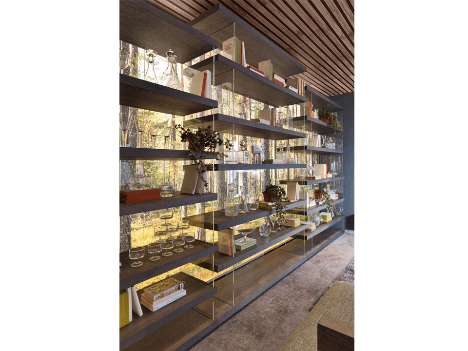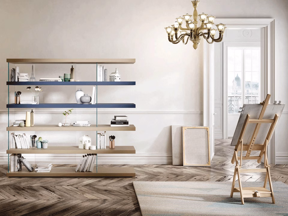 Free-standing and finished on both sides, Air shelving can also be used in the middle of the room to divide space in an elegant, airy way. No wall attachment is needed and so it can also be set up in front of walls with special decoration.