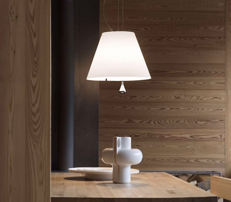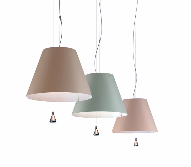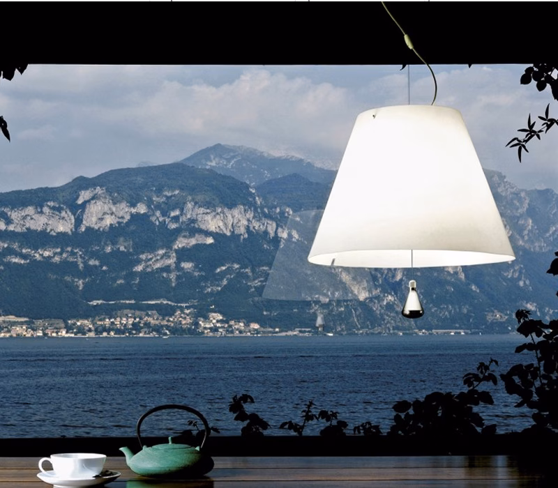 Elegant and light, this lamp emits a pleasant warm light through a silk/screened polycarbonate shade. The lamp’s height may be adjusted by means of a characteristic stainless steel counterweight.