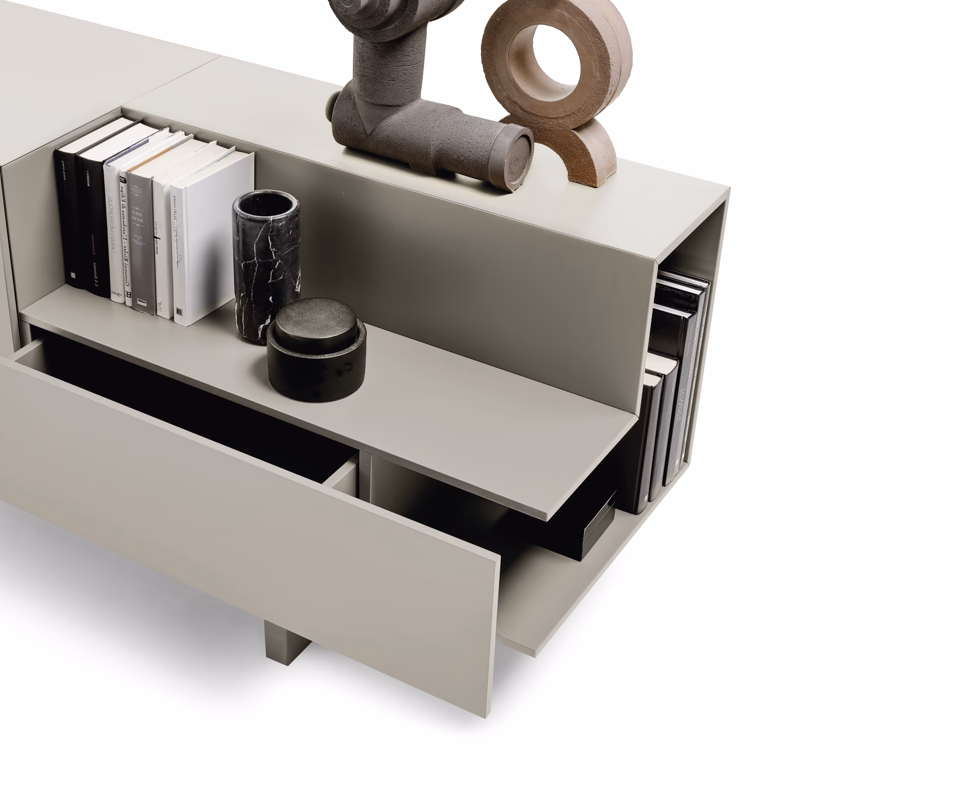 Ella is a sideboard with structure in mdf lacquered in all colors as per sample card or plated in heat-treated black oak. Container with a linear design thanks to simple and pure elements placed side by side and superimposed, of empty and full spaces that take on an architectural character within any room of the house.