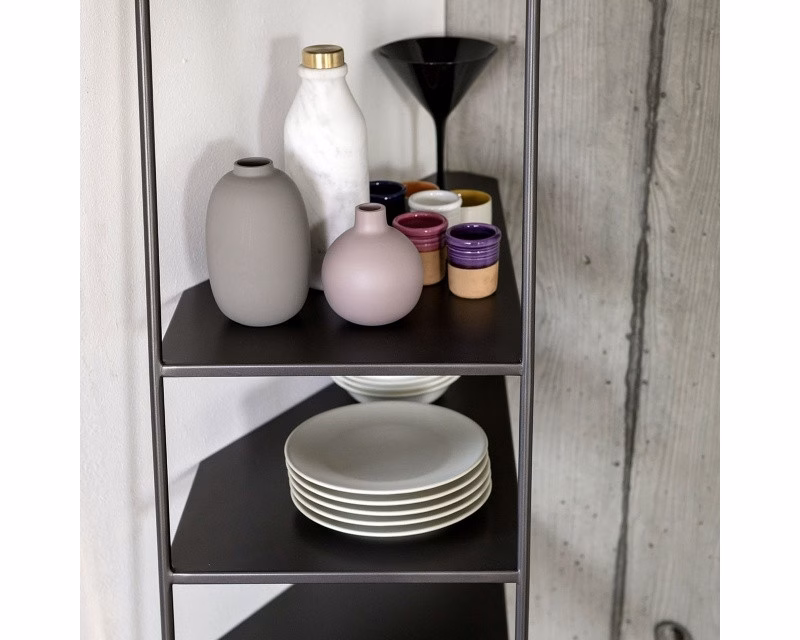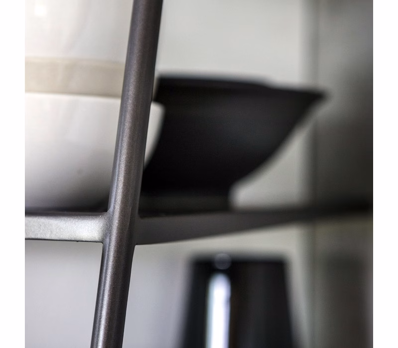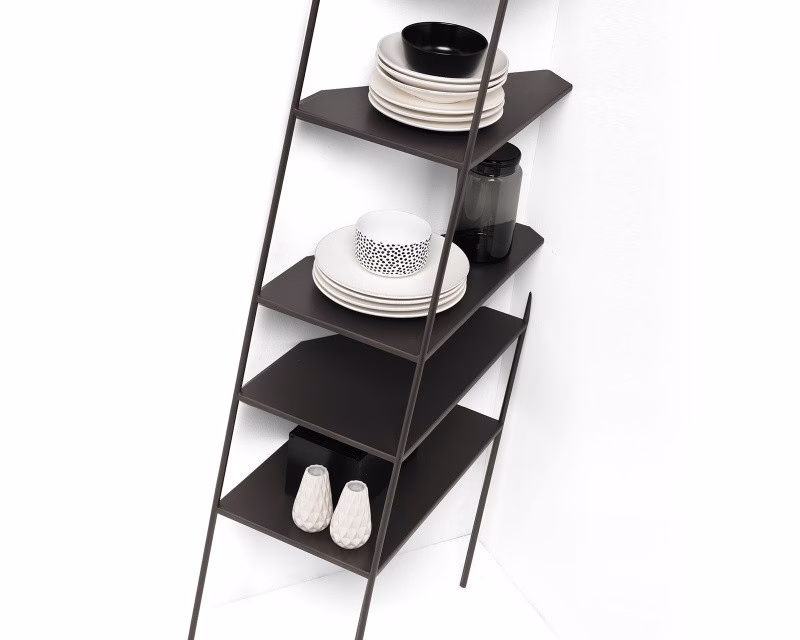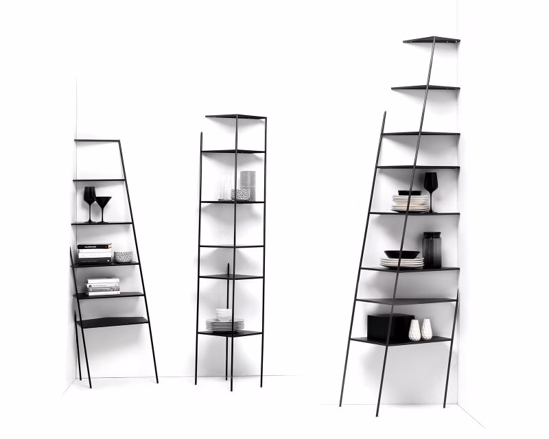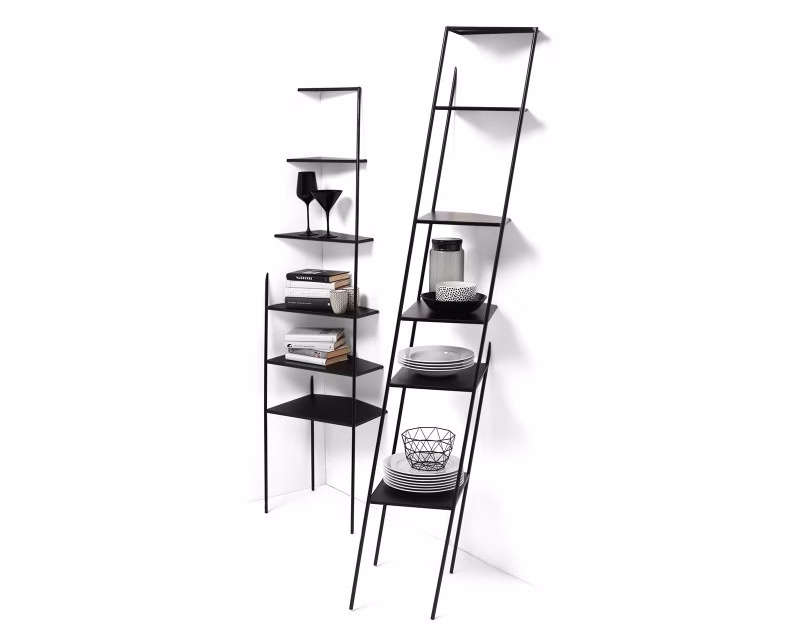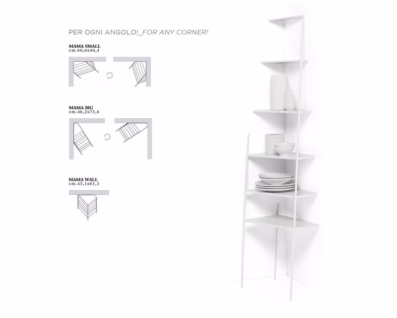 Mamà is a metal étagère available black or white. Mamà stands out for its ability to be almost invisible, resting on the wall and creating an optical illusion. Available in three sizes, two angular and one flat. Requires wall fixing.