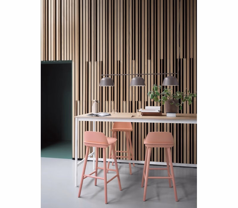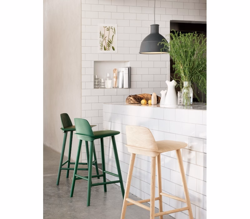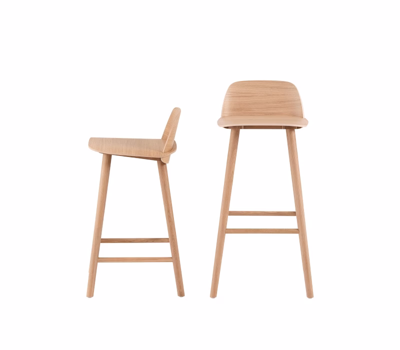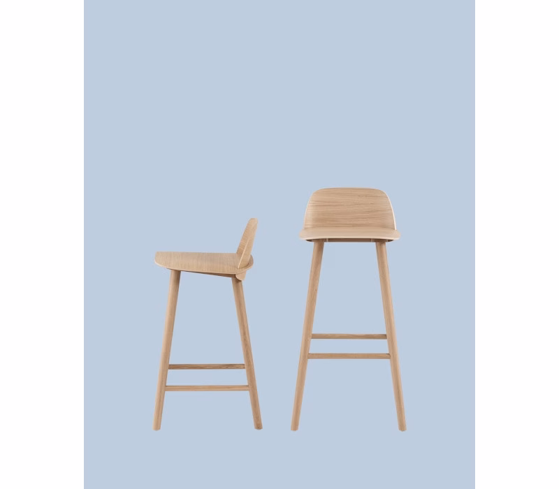 - Product Material: The back and seat of the Nerd Bar Stool is made in form-pressed veneer alongside its legs in solid wood — both with a water-based lacquer. Glides in plastic.