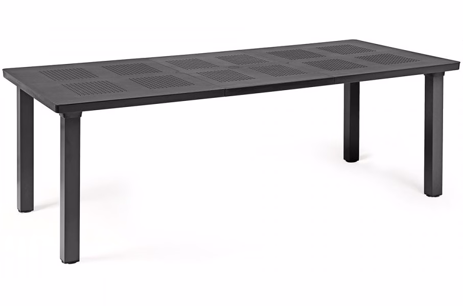 DurelTOP in polypropylene with UV additives and uniformly coloured. Squared legs in coated aluminum. Matt finish. Adjustable height feet. 160 – 220 x 100 x 74h cm. Recyclable resin.