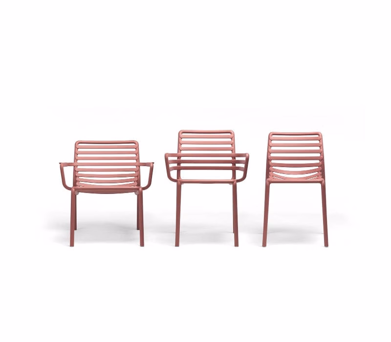 Monobloc armchair. Material: uniformly colored fiberglass polypropylene resins with UV additives. Stackable. Matt finish. With non-slip feet. Cushion available to order. Recyclable resin.