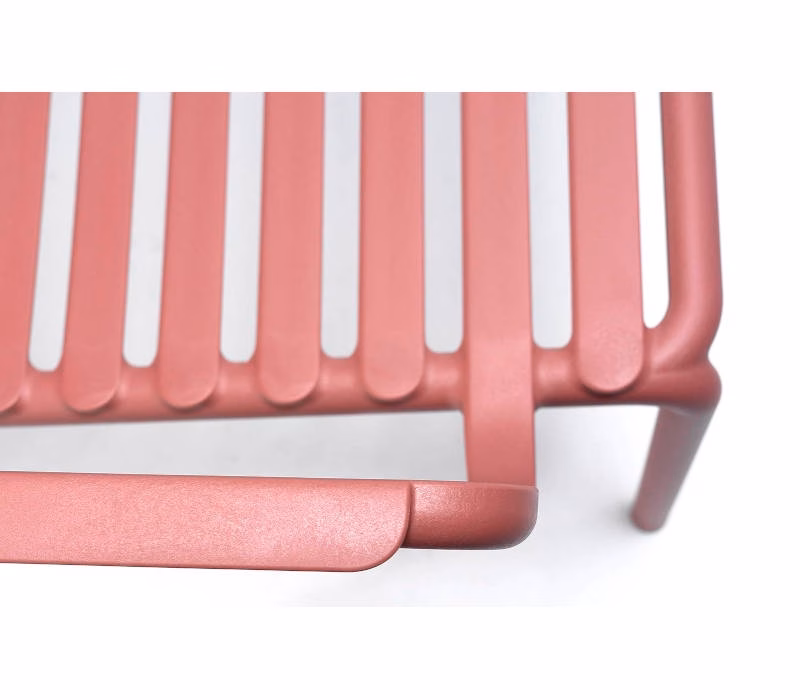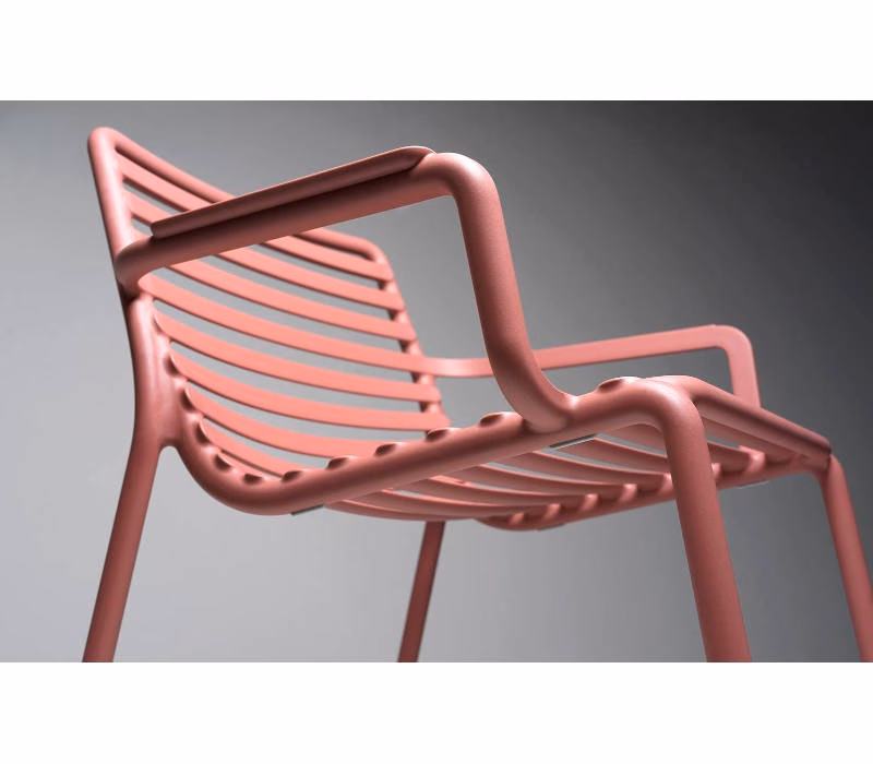 A relaxing, large, low armchair for outdoor use made of fiberglass resin, featuring an interplay of open and closed spaces punctuated by a sequence of horizontal slats. Stackable, easily sanitized and recyclable.