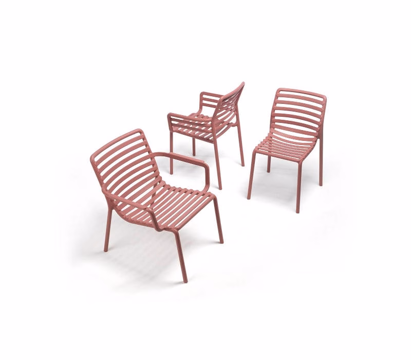 Monobloc armchair. Material: uniformly colored fiberglass polypropylene resins with UV additives. Stackable. Matt finish. With non-slip feet. Cushion available to order. Recyclable resin.