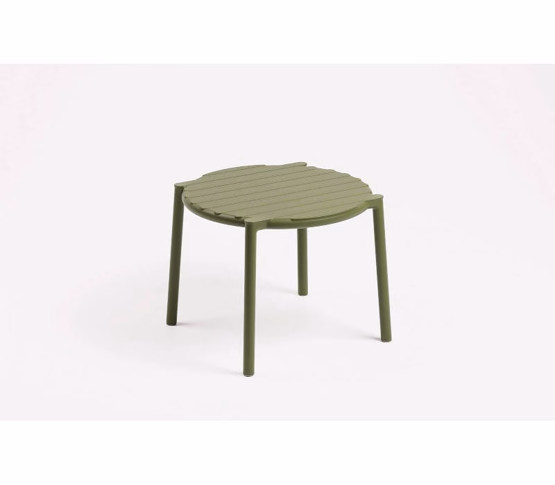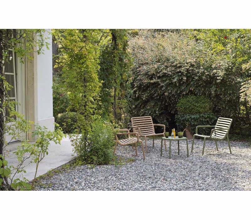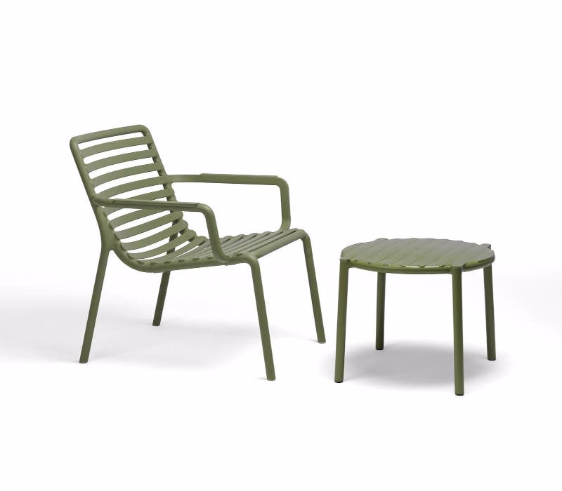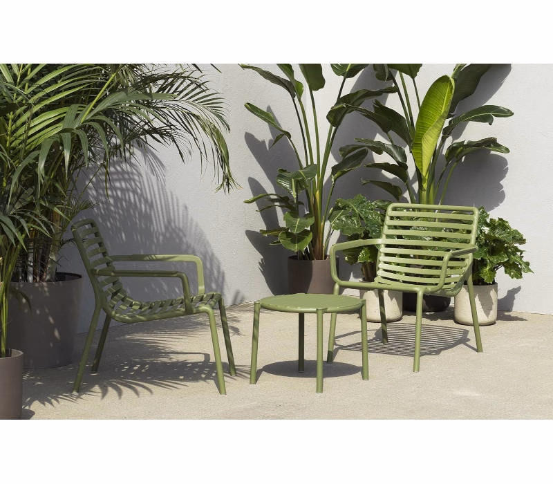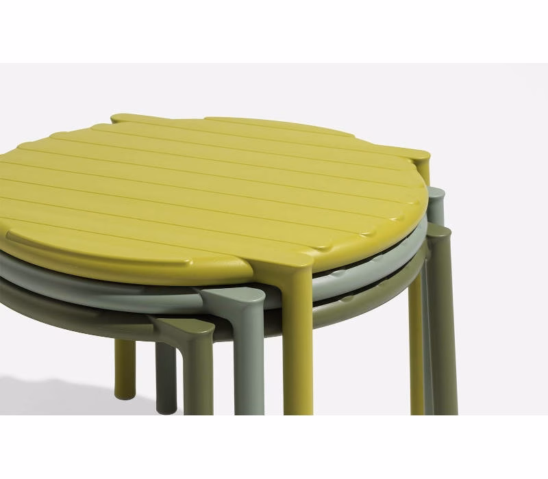 The slatted design is given a contemporary look for the Doga table, a monobloc low table in fiberglass resin with a round top and a new, lightweight design. It is handy to move, stackable, easily sanitized and entirely recyclable.