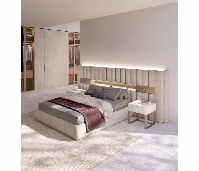 Modular bed characterized by a headboard with upholstered vertical slats and a free-standing sommier. It is available in various versions: wall-mounted or with structure; low (130cm) or high (floor to ceiling height to centimeter, max 295 cm.); standard width (18 slats) or made to measure; with open niche and box for Led spotlights or vertical metal inserts. Available in the entire selection of Oliver Mobili’s sample book fabrics and leather or even with customer fabric / leather. It is possible to complete the head with the insertion of LED spotlights, wireless charger and controlled sockets