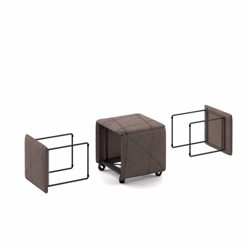 Surprising, transformable, essential, are just some of the adjectives that best describe this innovative item. The futuristic study of intersections hides five chairs inside, four of which are comfortable chairs with upholstered backrests. A unique item easy to use, equipped with four sliding wheels for easy handling, and an elegant double stitching design to simplify the opening and closing system.