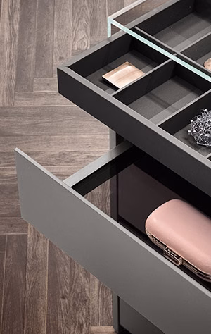 Functional walk-in closets. These can be customised and there are a wide range of complements available: illuminated or mirrored back panel, make-up vanity and space-organising accessories.