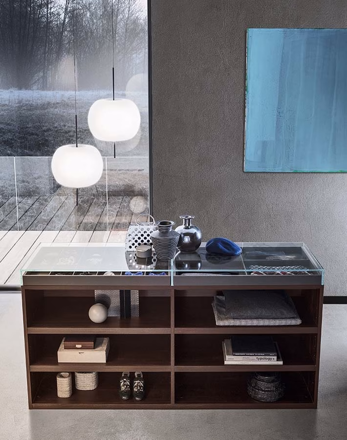 The Island module appears like a dreamy oasis in the middle of the room: an island for walk -in closets evoking the most exclusive boutique furnishings, directly in your home sea. Thanks to the possibility of being equipped with draw ers, shelves and shoe-racks, it’s an useful and versatile shelter for any kind of wardr obe; moreover, it offers space for jewels and valuables, or for emotional and simple but priceless memories, inside an elegant display cabinet that comfortably contains and safeguards your most precious treasure.
