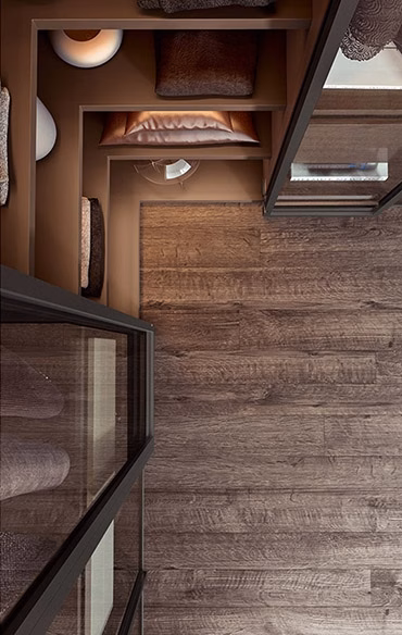 Just as if they were arranged in a personal boutique, your objects and garments must be enhanced and exhibited with elegance and order. The glass doors, defined by a Gunmetal Grey or metallized brown frame, set off and add a finishing touch to arrangements. The visible interior accessories show off their great ability to efficiently organise spaces with style. The hinged doors come with special pivot hinges that can open at a 180° angle.