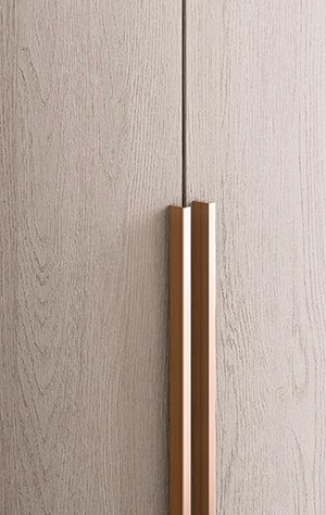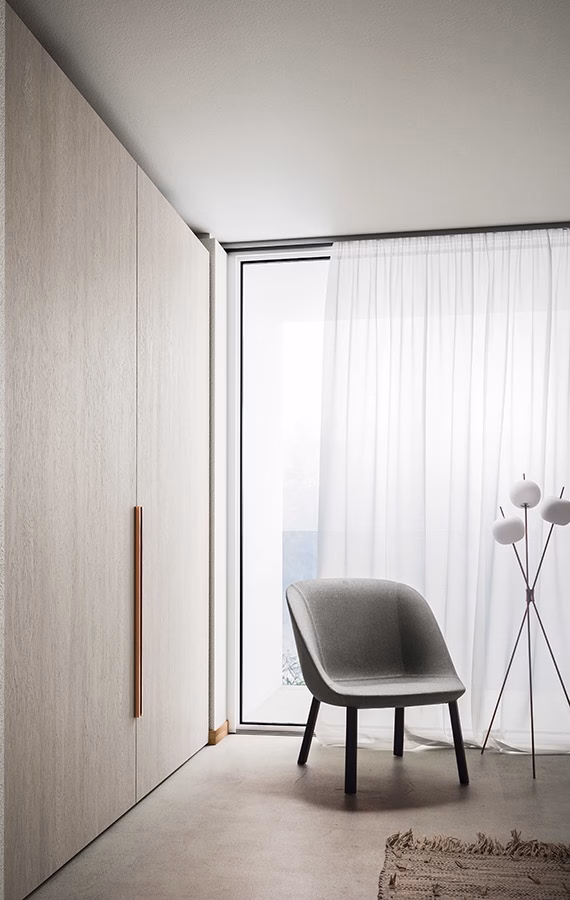 Custom-made wardrobes with maximum design freedom: multiple finishes, 2 depths, 3 heights, 7 widths, 3 opening options (hinged, sliding and flush), 11 types of smooth, decorated and framed doors.