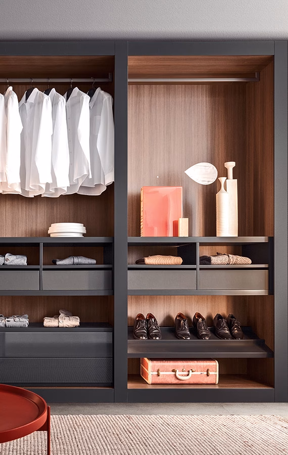 Curtains dissolve to reveal elegance, order and refinement on stage. Sipario is made up of wardrobe modules without doors that can be unrestrictedly put together to suit individual practical requirements and aesthetic preferences. In the framed version, the vast array of finishes is enhanced by a wide frame that gives the arrangement an even warmer and more sophisticated appeal. To satisfy any requirement, our range of interior accessories is the same available for our wardrobes.