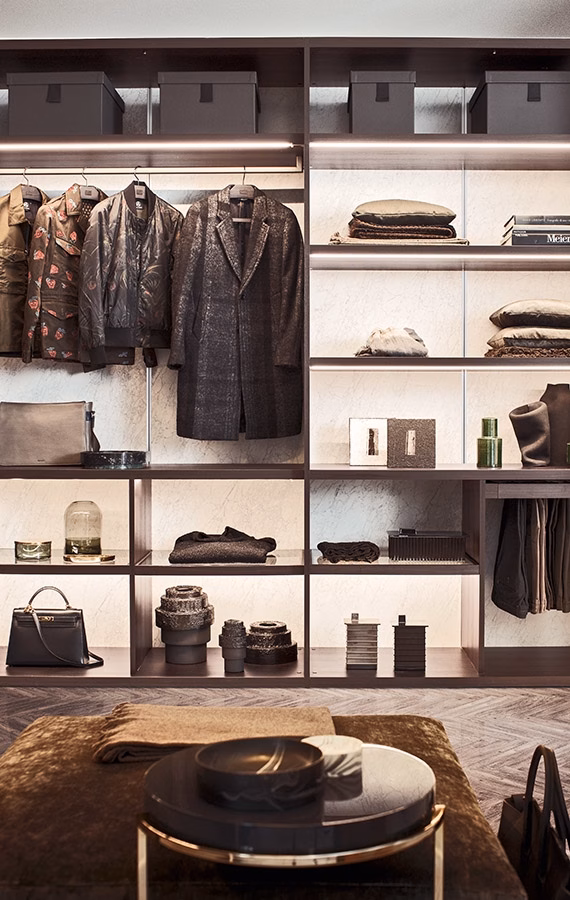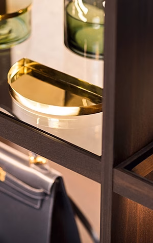 Functional walk-in closets. These can be customised and there are a wide range of complements available: illuminated or mirrored back panel, make-up vanity and space-organising accessories.