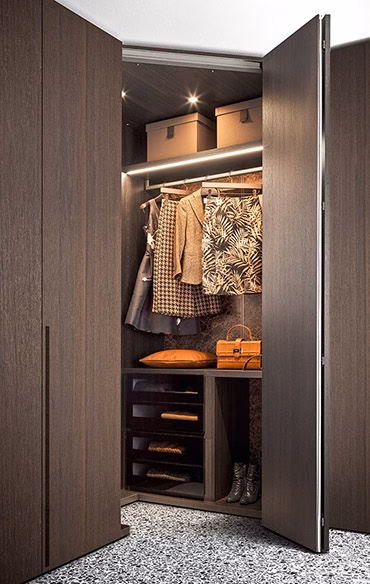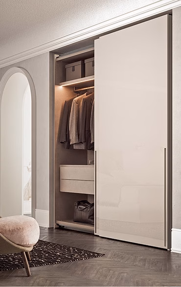 Aesthetic minimalism and functionality are an unbeatable combo. This wardrobe’s success lies in its consistent simplicity and in the power of its minimal lines. Tratto integrates and blends the door parts while carving the handle out of the panel. Vertically recessed near the edge of the door, it offers a sound grip on both hinged and sliding doors. Surfaces feature uniform materials available in all the lacquers and wood types of the collection.