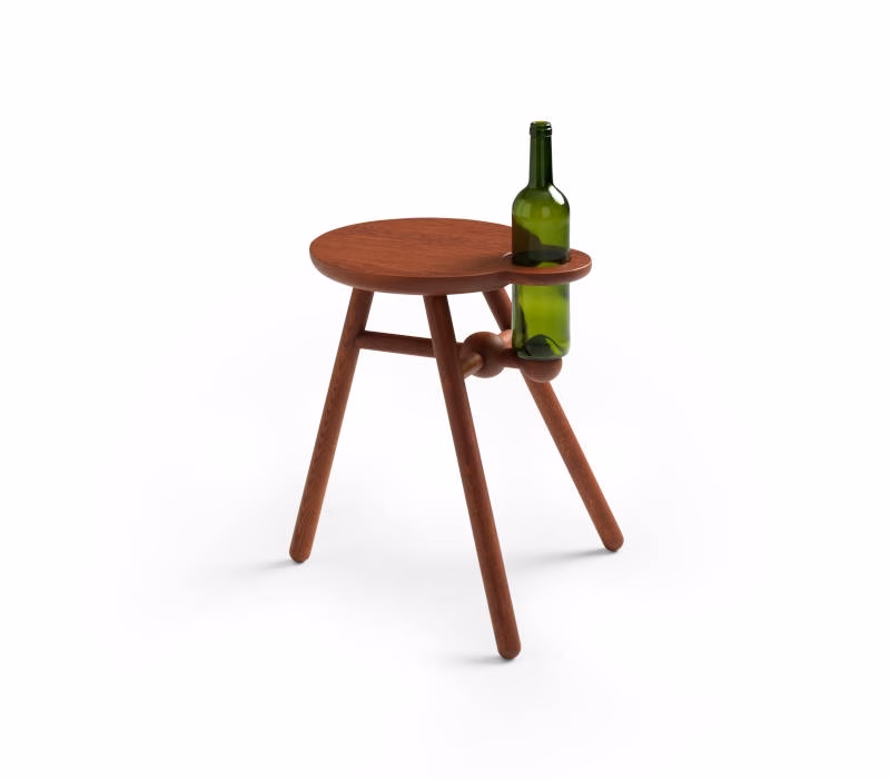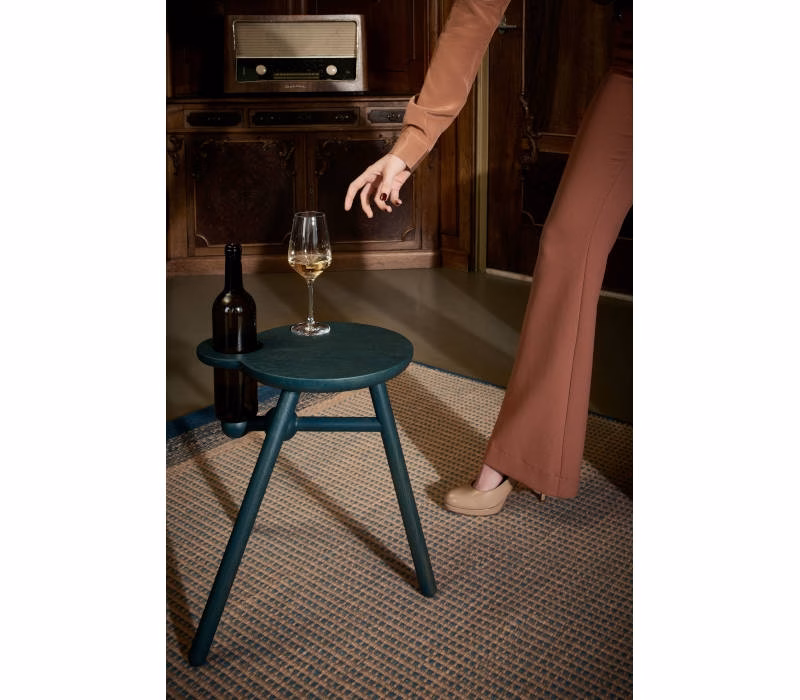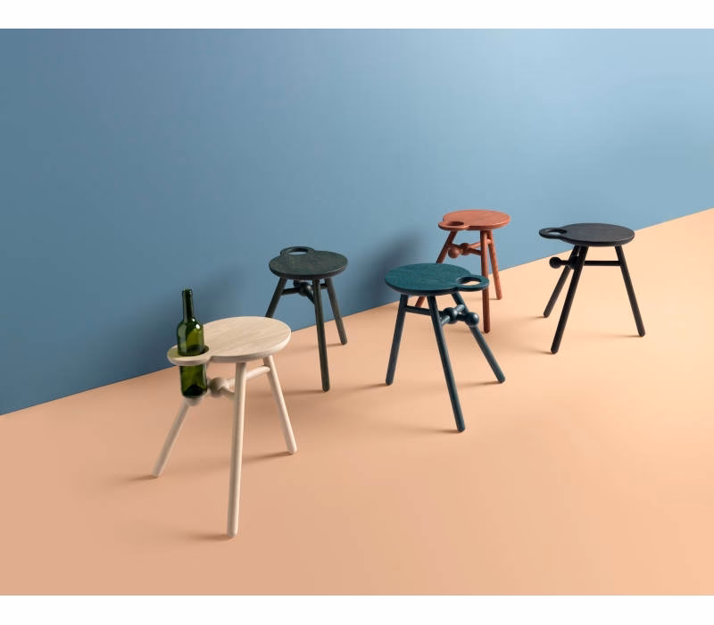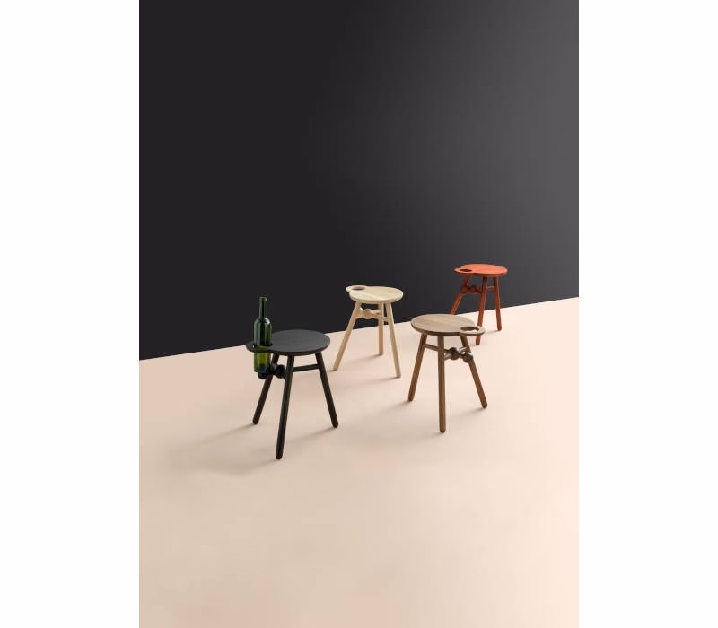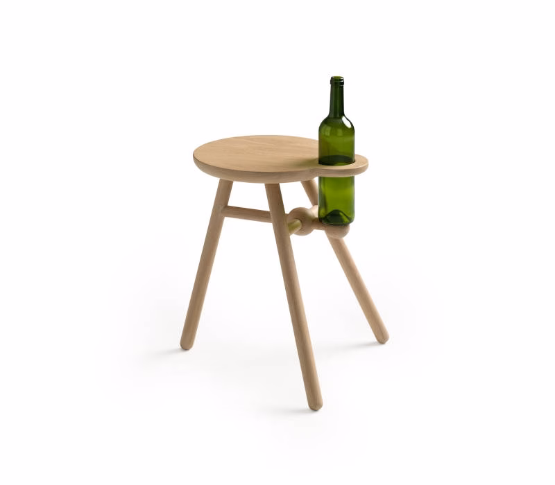 The Bottle Stool designed by Kranen/Gille was a huge success from the moment it was introduced. It’s a winebottle holder, a stool and a cheese plank all rolled into one, but above all it’s a table that can’t help but attract everybody’s attention. The Bottle Stool is handy and mobile because the ‘ring’ that holds the winebottle can also be used as a handgrip. Jos Kranen and Johannes Gille have managed to combine an impressive number of functions in one design.