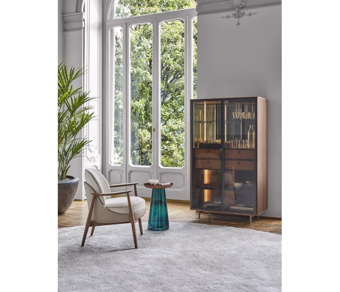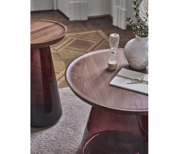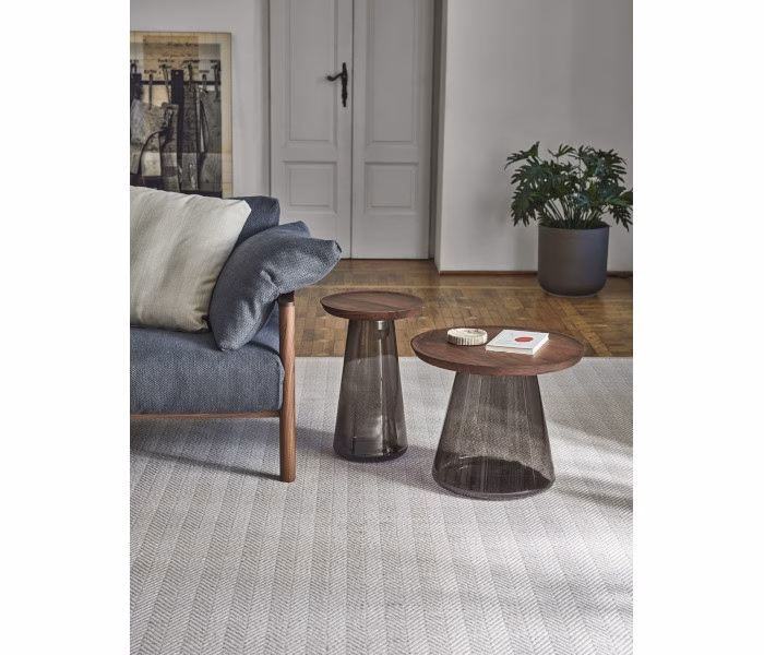 Series of coffee tables with base in blown glass and top in solid wood. The glass is blown using the traditional Murano artisan technique, thus ensuring a lightweight aesthetic for the product. The thick top is made of solid canaletta walnut or ash wood, with a slightly recessed shape to create a perimeter moulding. Jig coffee tables can be purchased individually or as a set to meet various interior design needs and create harmonious compositions in the living space