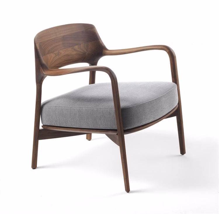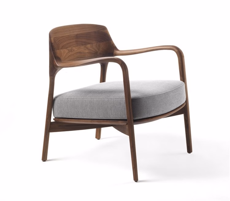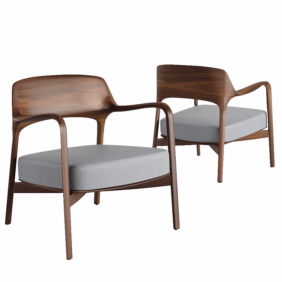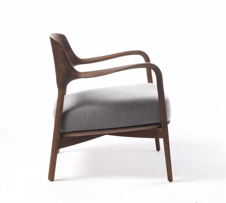 Armchair with frame in solid canaletta walnut. Seat in solid canaletta walnut with density foam padding with internal support in plywood and cover in the fabrics of the collection. Nylon end-feet.