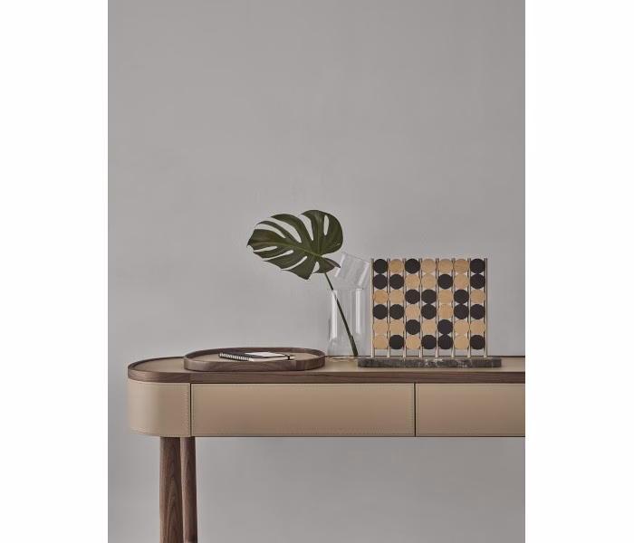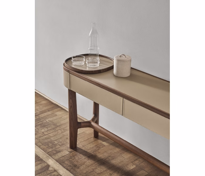 Inspired by the lines of Poradas Tillow collection, the Rami collection is characterised by simple shapes with significant thickness to give the product a solid and organic appearance. The Rami console table comes with a structure in solid canaletta walnut, while the tabletop is available in wood, leather, or Rock with frame in solid wood. To enhance its functionality, two large drawers are integrated into the container lined with leather. The tabletop is designed with a space for the Rami Tray, a service tray in canaletta walnut with leather top