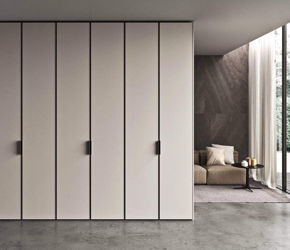 Swing door wardrobe featuring doors with a panel available lacquered, in lacquered glass or covered with leather or tecnopelle. The door also features a lacquered metal frame with a handle applied to both sides. In the leather or tecnopelle version the door comes with double horizontal seams that start at the top and bottom edge of the handle.The door is also fitted with soft closing hinges.
