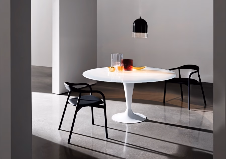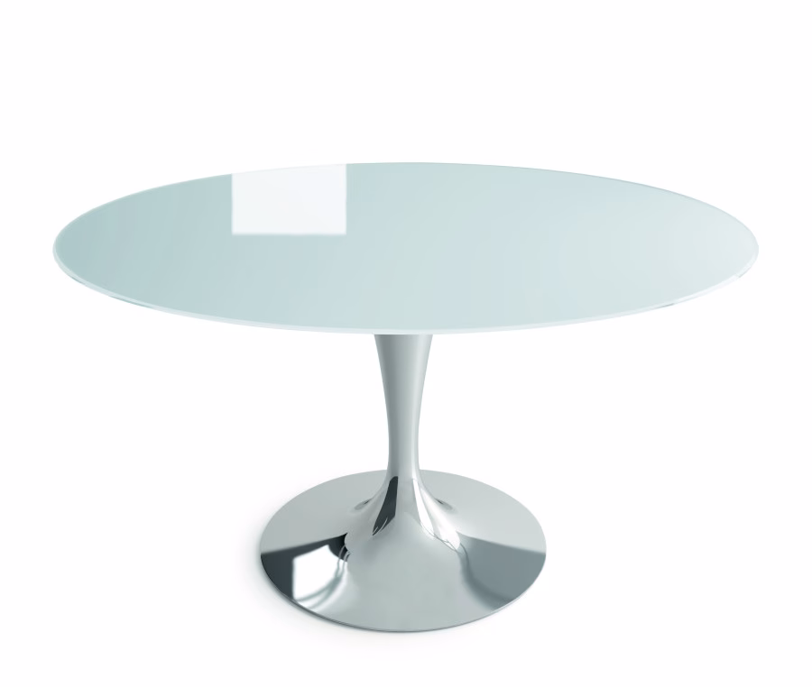Elegant and light like the namesake glass, this table expresses different personalities according to the chosen materials and colour combinations: from the top in lacquered glass, Materia, wood, ceramic or hpl, to the base in lacquered or polished chrome metal.
