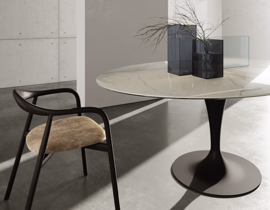 Dining table with chromed or lacquered metal base, different finishes. Top available in tempered glass, MATERIA or ceramic, various finishes.