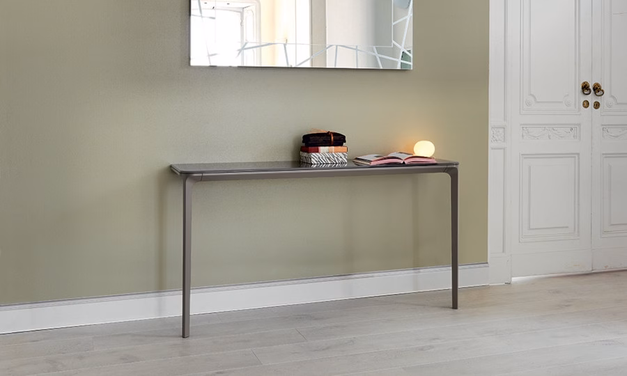 Console with two die-cast aluminium legs, polished chrome finish or lacquered, various finishes, and anodized or lacquered, various finishes, aluminium structure profile. Top available in tempered lacquered or frosted lacquered glass 8 mm th., various colours, or in Materia or ceramic, various finishes. The wooden top is available in the four legs version.