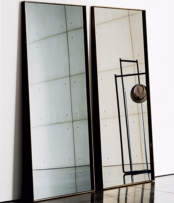 Floor or horizontal/vertical hanging rectangular mirror with lacquered metal frame, mocha or burnished brass finish. Central mirror available in different shades.