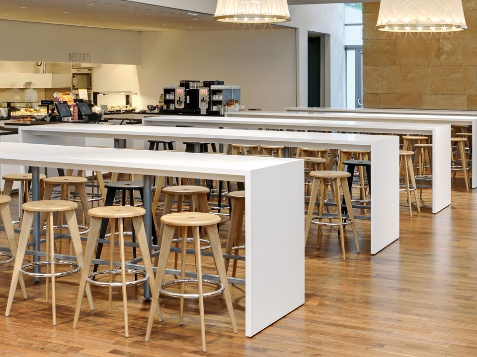 The classic Tabouret Haut bar stool by Jean Prouvé is available in robust solid oak, with a natural or dark stained finish. The chrome-plated steel ring with an anti-skid surface guarantees stability and offers comfortable use as a footrest.