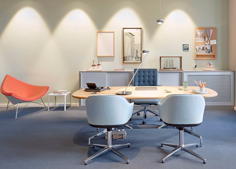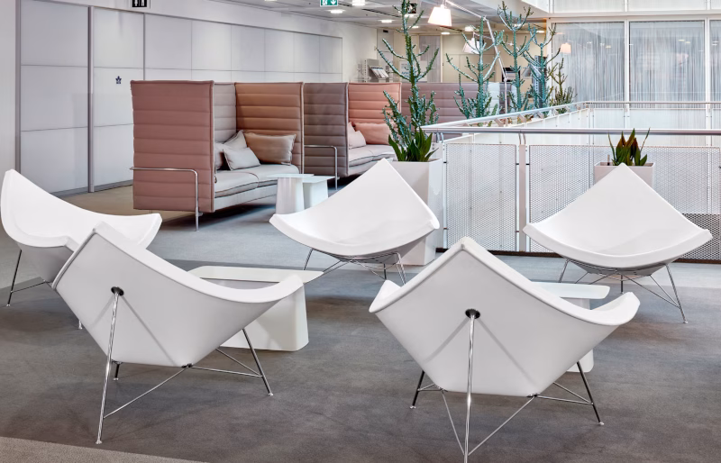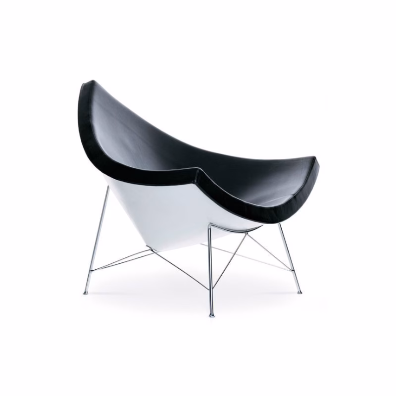 The comparison of the Coconut Chair to an eighth of a sectioned coconut goes back to the designer himself, George Nelson – a prominent exponent of American mid-century modernism. However, the colour scheme of this iconic, spacious lounge chair is reversed: the outside of the plastic shell is white, while the comfortable one-piece upholstery is covered in high-quality leather or fabric in a variety of colours.