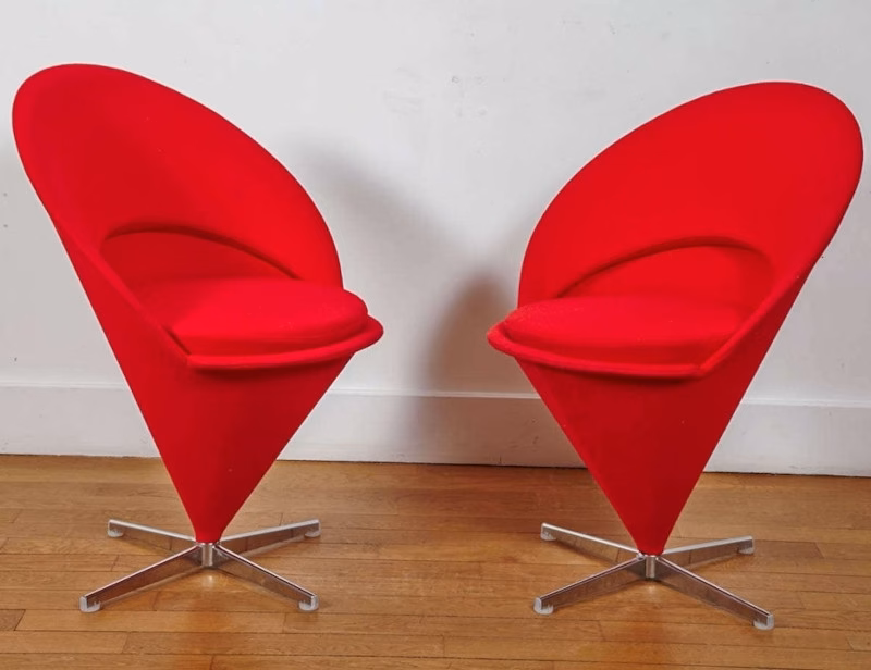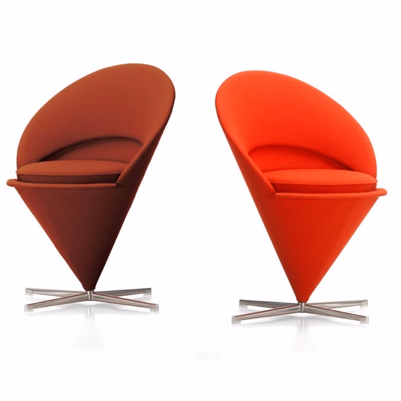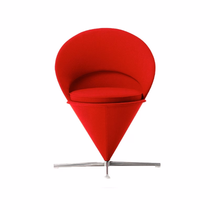 Verner Panton originally designed the Cone Chair for a restaurant in Denmark. It takes its shape from the classic geometric figure for which it is named. The padded shell forms the back and armrests and, together with the soft seat cushion, creates an exceptionally comfortable armchair, which is mounted on an elegant stainless steel swivel base. The matching Cone Stool makes an ideal companion for the Cone Chair as a stool or ottoman.