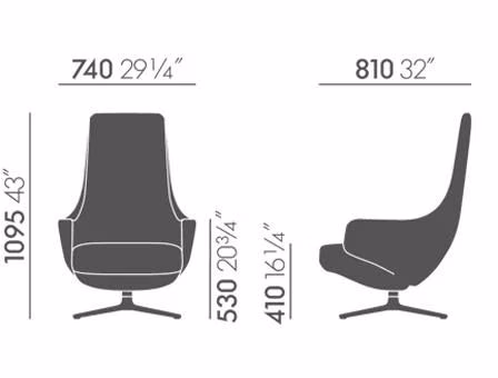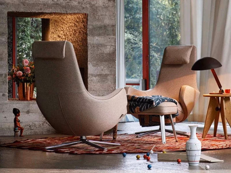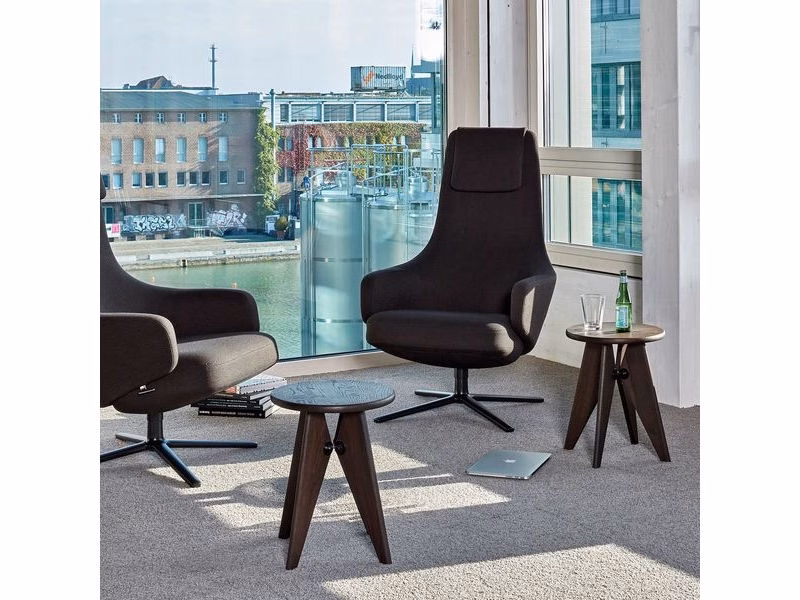 The swivel-based lounge chairs Repos and Grand Repos offer unparalleled comfort with their generous padding, inviting armrests and synchronised mechanism concealed beneath the upholstery. The chairs allow the sitter to move from an upright position to a reclined angle for resting, locking the backrest in any position. The resistance of the backrest can be manually adjusted to the user’s weight.