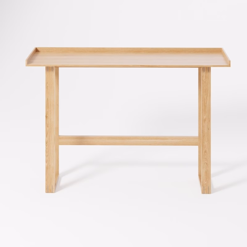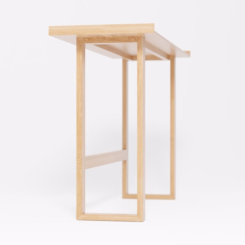 ‘Slim’ is ideal to use as a laptop desk, writing table, dressing table or side console table. The design’s simplicity makes it suitable for many different room environments. The slim dimensions allow it to be placed in various places and spaces. The lipped edge on three sides stops things falling off. Solid oak supported legs provide a stable, rigid construction