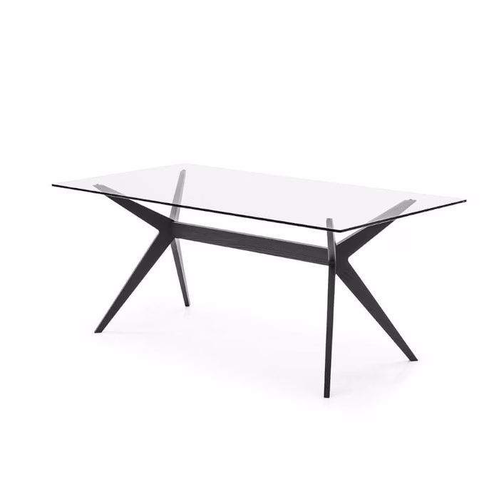 KENT is a non-extending table whose design evokes the furniture of the 60s and 70s. The different-sized tops are available in round and rectangular designs in transparent glass. The wooden frame features shaped legs which support the different tops and a wooden beam as a connecting element