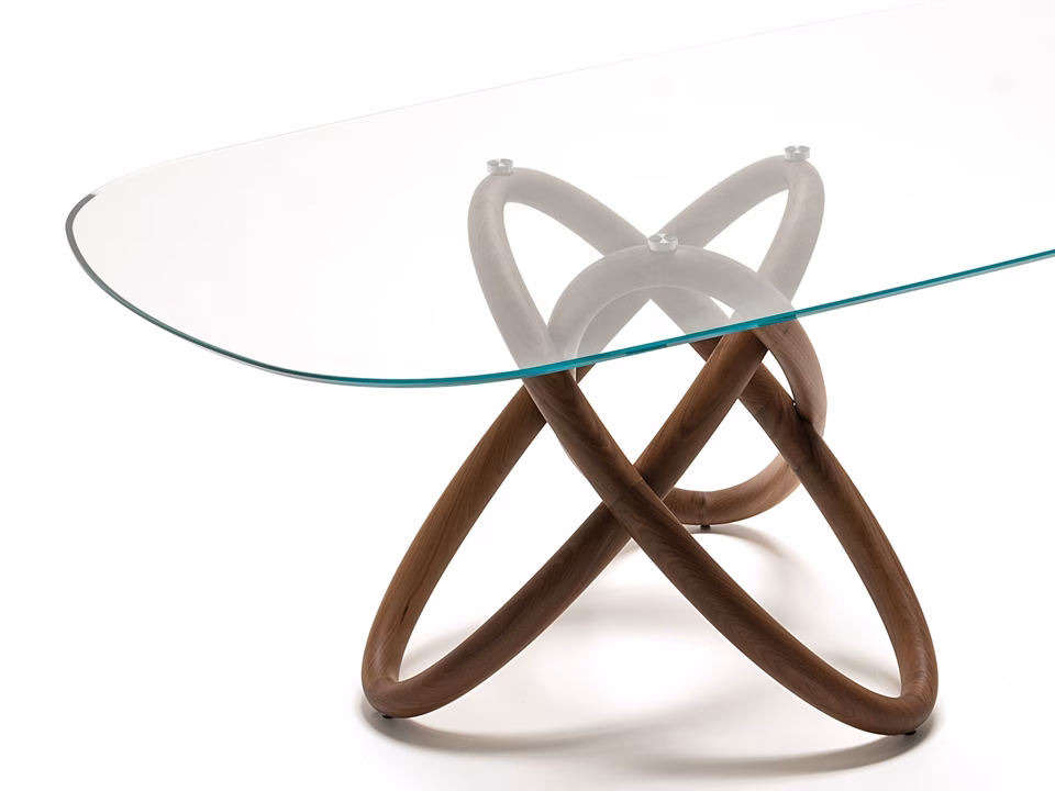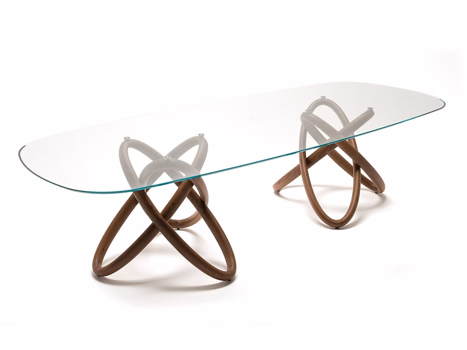 Table with base in solid Canaletto walnut wood (NC). Top with plates in 15mm clear glass or extra clear bevelled glass.