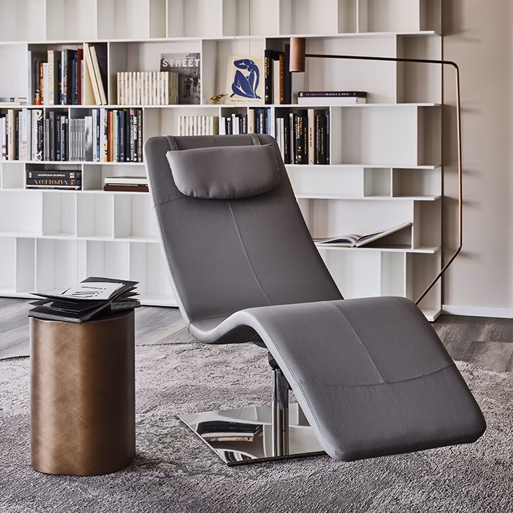 Swiveling and adjustable chaise longue. Polished stainless steel or black (GFM73) embossed lacquered base and wooden frame upholstered and covered in fabric, synthetic nubuck, micro nubuck, synthetic leather or soft leather as per sample card. The cover is not removable.