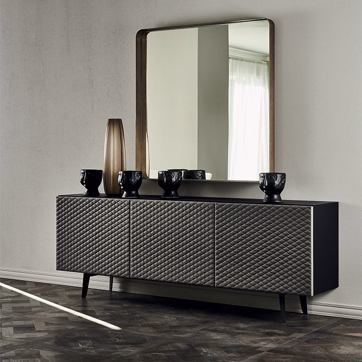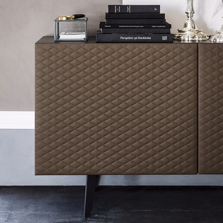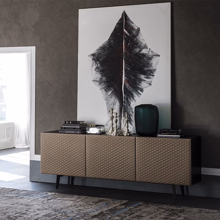 Thanks to a quilted upholstery in soft leather or synthetic leather, the sideboard Absolut makes the modern living room warm and welcoming. This design cabinet, equipped with 2 or 3 doors, is manufactured with the finest quality materials, such as the soft frontal upholstery. Choosing among different coverings and precious finishes, it is possible to customize this modern sideboard in order to adapt it to your own design living area, granting a unique style.