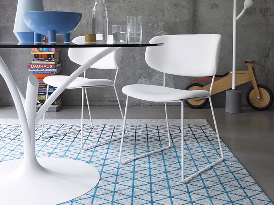 CLAIRE M chair with metal frame and upholstered seat/backrest. Sled base and wide backrest. The CLAIRE M sled chair is characterised by a large seat and a contoured backrest that are slightly upholstered to ensure maximum comfort. Real leather cover. The chair is also fitted with four plastic shockproof, neutral coloured feet, positioned under the sled base. The colour coated metal frame, in matching colour with the upholstery, enhances the lightness and graceful lines of this chair that is perfectly suitable for today’s living spaces.