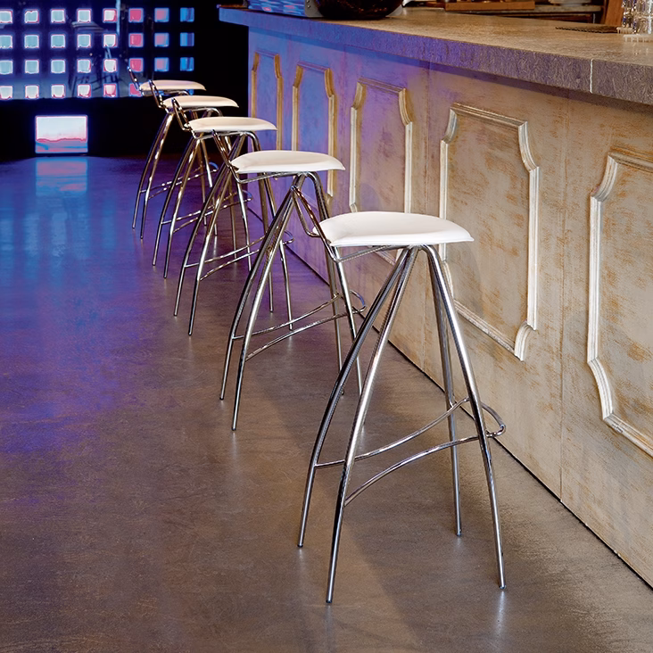 Stool with chromed (08), black chrome (06), black (OP17), white (OP71) or graphite (OP69) lacquered metal frame and seat in leather as per sample card. Standard stitching.