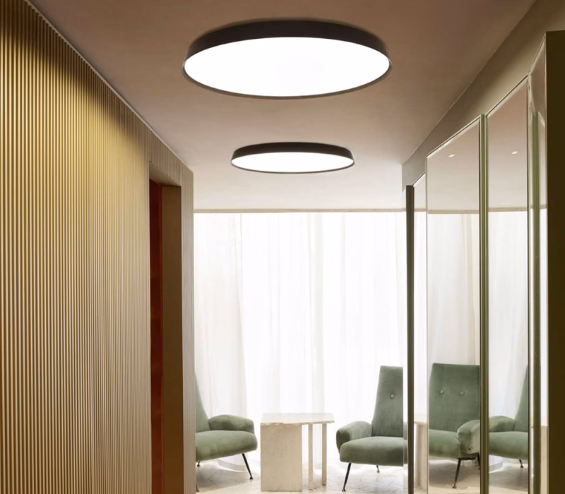 Compendium Plate is another extension of the lumi – nous alphabet of the Compendium family, now interpret – ed by Daniel Rybakken in the ceiling and applique versions as well. The external profile in anodized extrud – ed aluminium conserves the slim original thickness, creating a surface almost flush with the wall. In spite of its extremely slender design, Compendium Plate provides extraordinary lighting efficiency combined with a clean form and extreme elegance