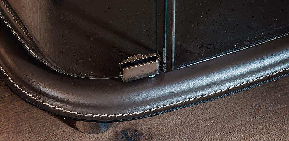 Clear glass showcase with top and bottom covered in leather as per sample card. With 2 led lights. Max capacity: each shelf kg 10.
