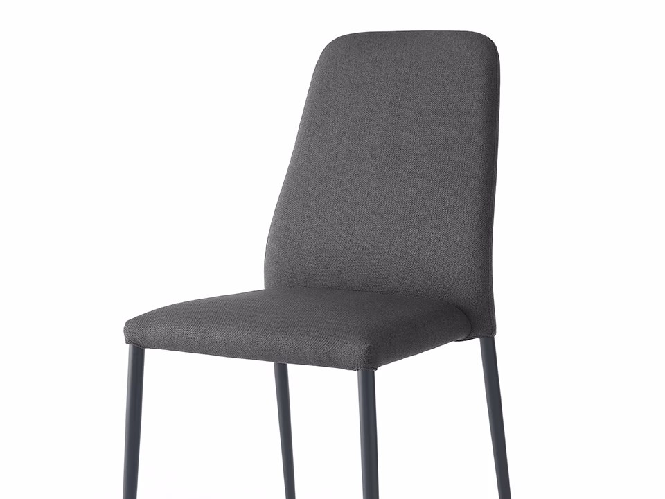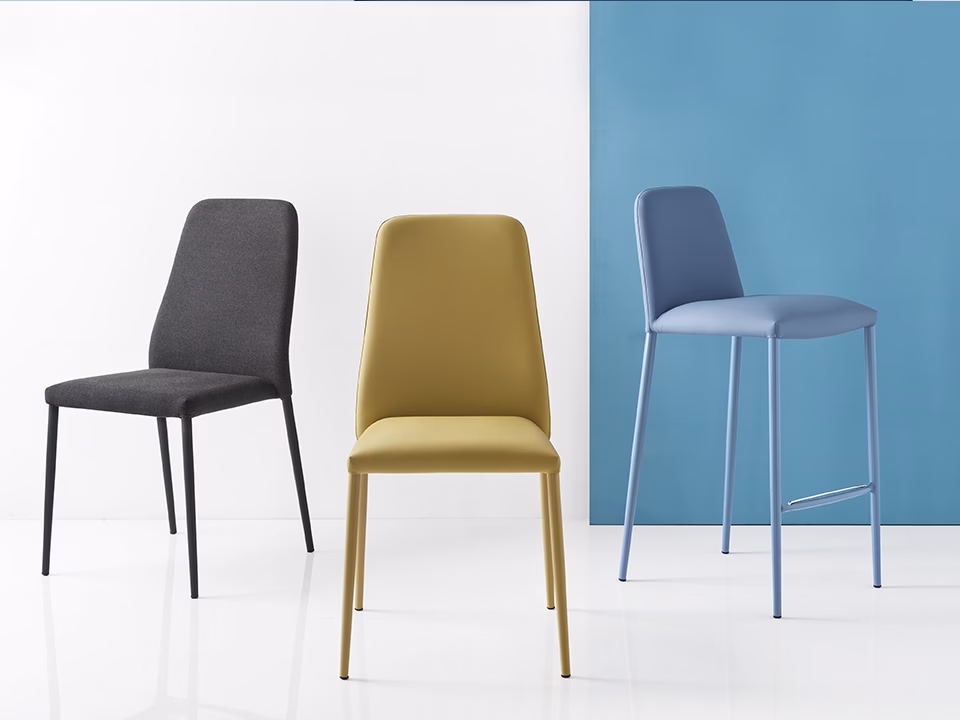 Club metal chair with upholstered seat and backrest covered in fabric. Lightweight and practical chair, Club stands out for its versatility. The colour of the coated tapered leg always matches the seat. The uniform finishes make this chair perfect for both your dining and living area