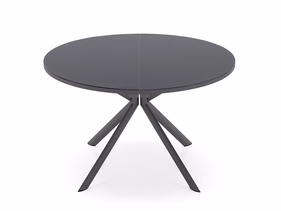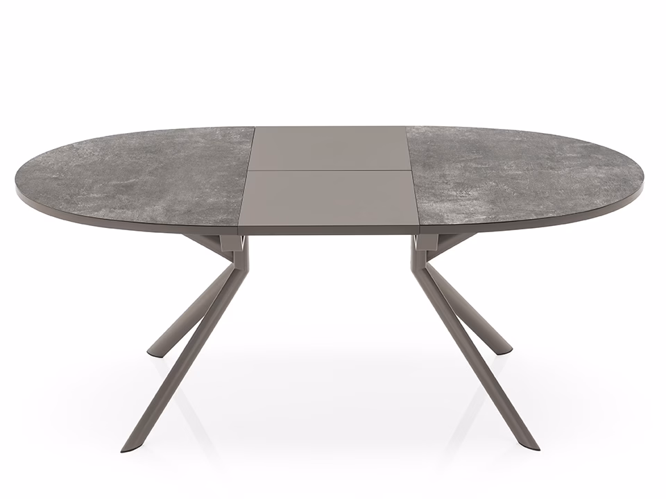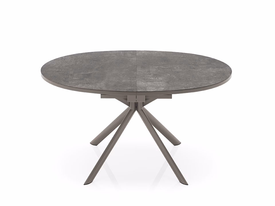 GIOVE extendable table with metal pedestal base with round top in wood, wood-ceramic or wood-glass. Fixed central metal base with four elliptical sloping legs and butterfly leaf opening with central leaf in the same colour as the base. The simple, bold lines of this table make it suitable for any living space.