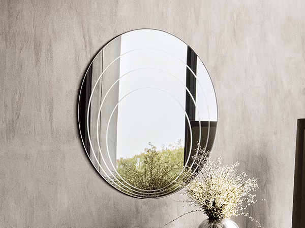 The LUNE model round mirror with decorative pattern in concentric circles. To be fixed to the wall. LUNE is a large round mirror with a smoky base decorated with a play of concentric circles of different sizes engraved on the surface. Dynamic, emotional and of a strong visual impact, it is perfect to give light with its reflections to the entrance of the house, in the living room or in the bedroom.