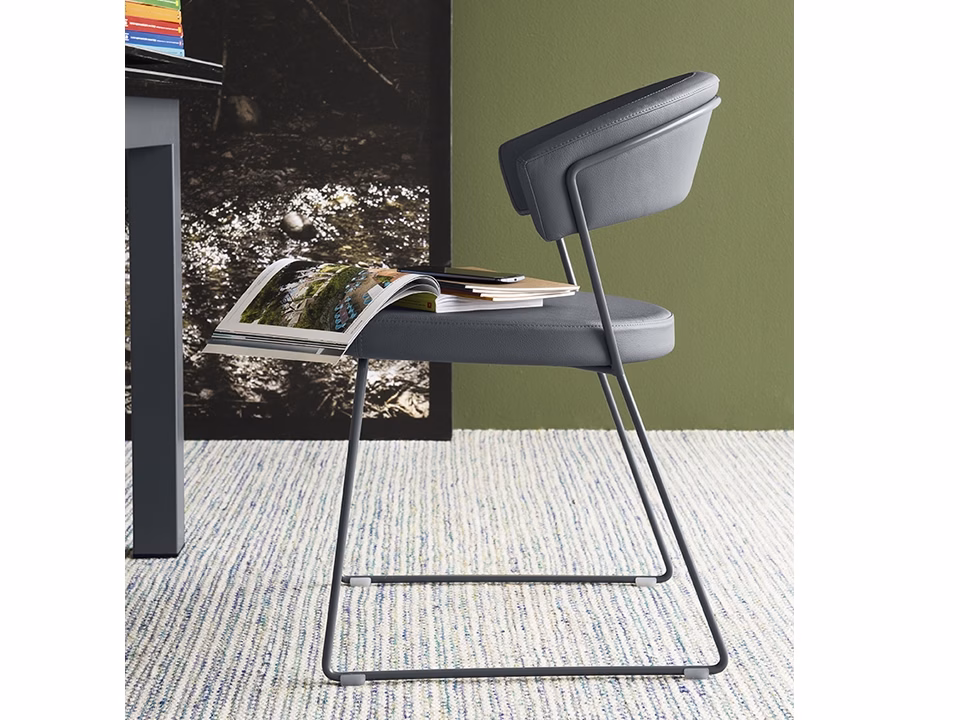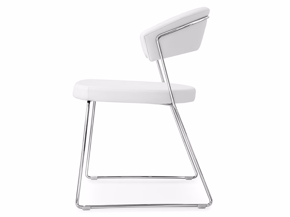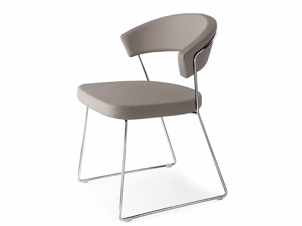 NEW YORK chair: metal frame and upholstered and covered seat/backrest. Sled base. The enveloping backrest and wide seat, which make the chair very comfortable, are both upholstered. The cover is available in BRIGHTON fabric (stain-resistant and antibacterial treatment) or EVOLUTION (leather on the inside and suede microfiber on the outside, waterproof and stain-resistant) or Skuba (synthetic material, easy to clean and soft to the touch) or in “Vera Pelle” (genuine Italian leather). The chair is also fitted with four plastic shockproof feet of neutral colour, placed under the sled base. Ideal to complement the decor of the dining room or study.