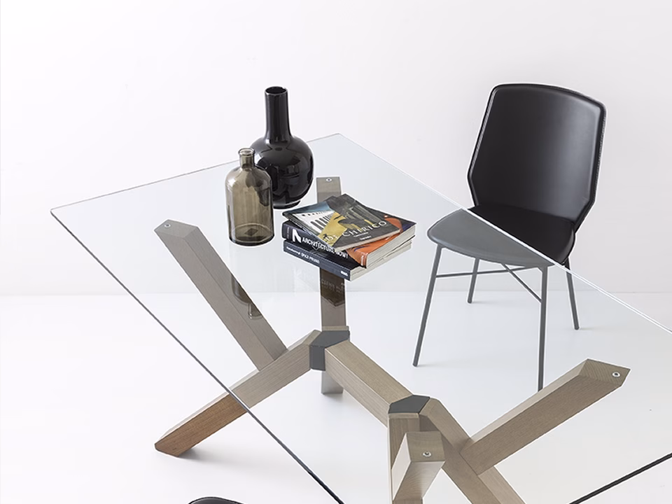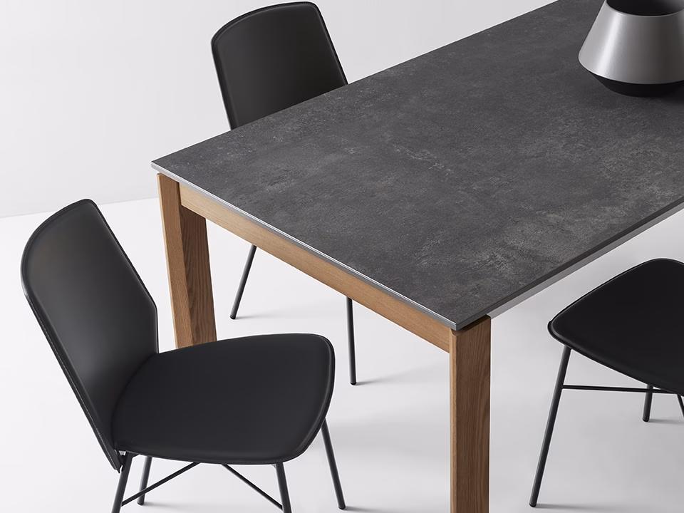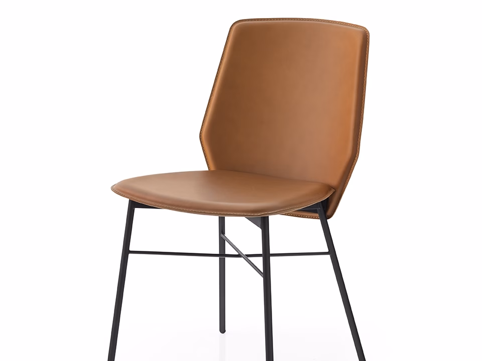 SIBILLA chair with metal frame and plywood seat covered with regenerated leather with visible matching stitching. Modern and functional, perfect for the dining area