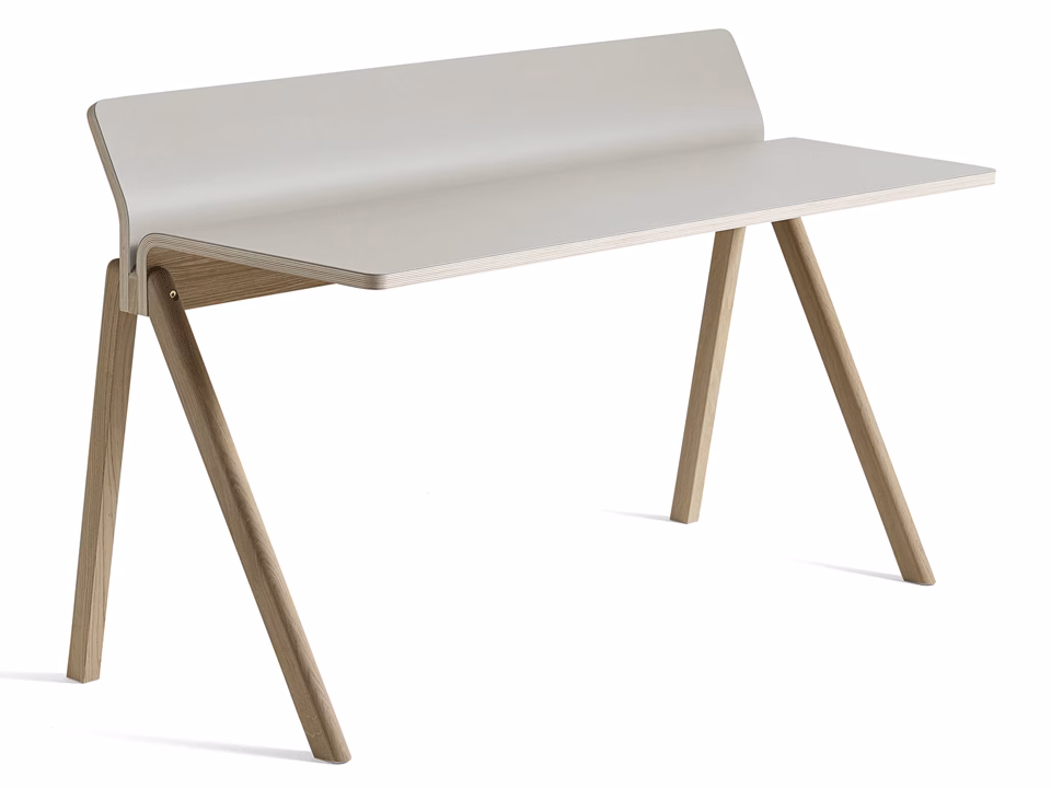 Sharing the same angled legs as the rest of the series, the tabletop of the Moulded Plywood Desk CPH 190 features a split at the back of the table, creating a useful upright backrest for supporting notes and open books, while the remainder serves as workspace. This has the dual benefit of making the desk more compact, at the same time it increases functionality. Ideal for using in a home office or in a work environment, it is crafted in oak with a clear lacquer.