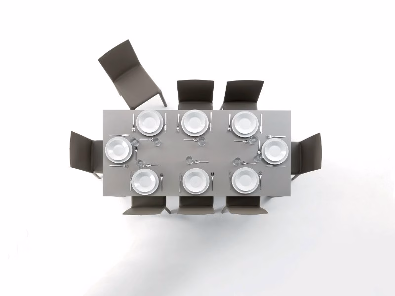 Extendable table with pull-out mechanism with one loose-leaf extension. Rectangular glass top in gloss extrawhite, gloss screen printed white, dove grey, dark brown or anthracite, or melamine top in white or moka, lacquered composite top in white, sand, mud or anthracite, or scratch-resistant Unicolor top in canaletto walnut, graphite stained veneered oak, brown stone, nanto’s stone, porphyry or lava stone.