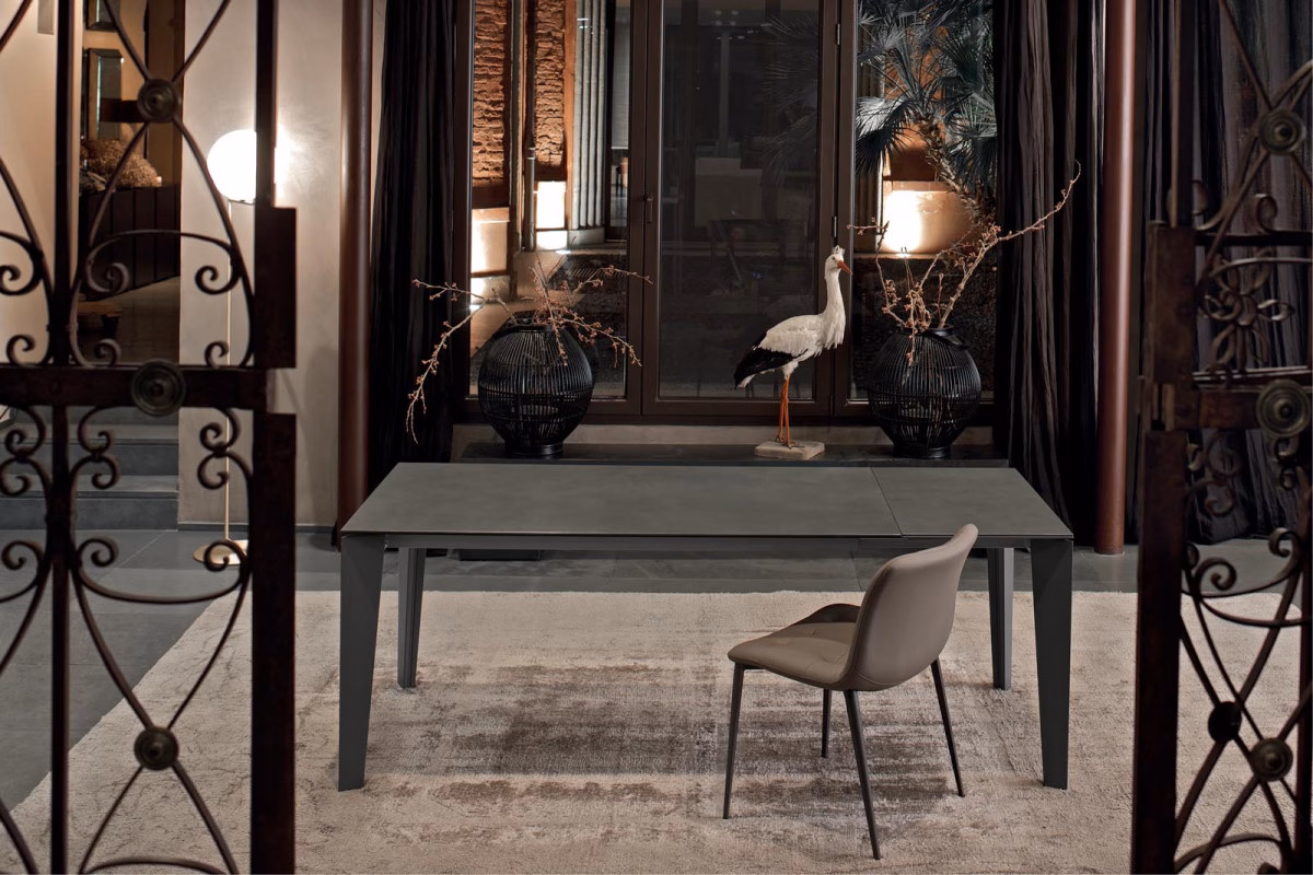 Table with 1 extension and lacquered metal frame. Top in melamine, laminate Fenix, scratch-resistant Unicolor, glossy glass, velvet matt anti-scratch glass or SuperCeramic.