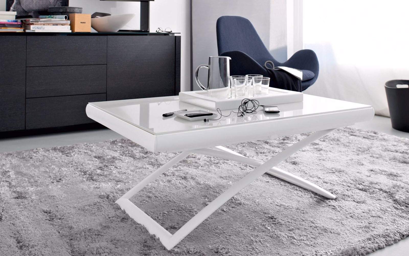 DAKOTA is a versatile coffee table for your living area which, if necessary, and with just a few movements, turns into a dining table for 6-8 guests: just press a button, placed on the long side, to adjust the height to 7 different positions.